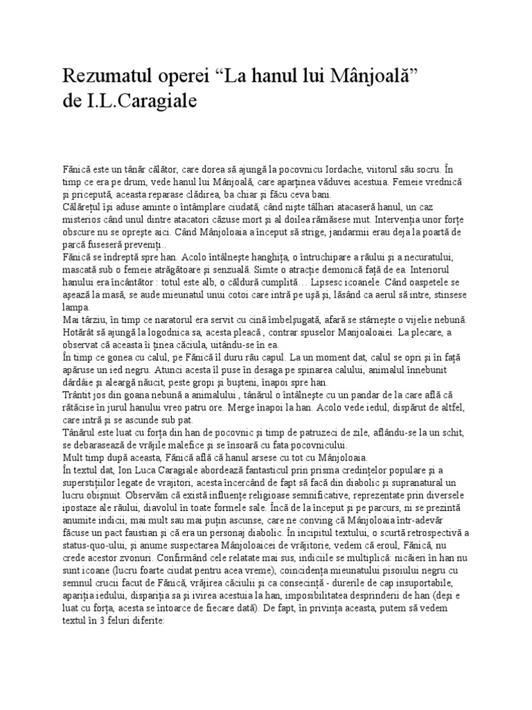 Rezumat Pe Scurt La Hanul Lui Manjoala De I L Caragiale